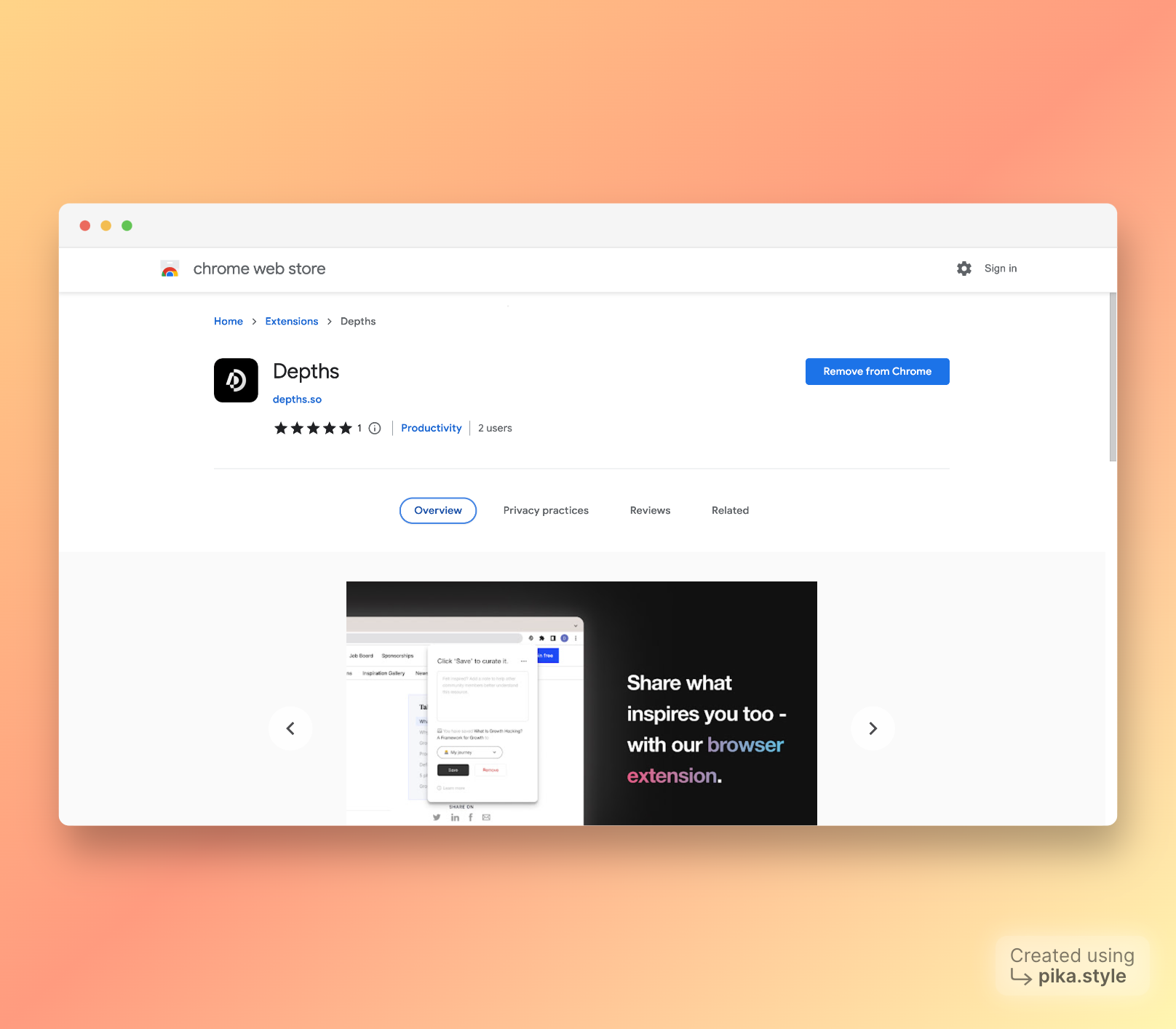 <figure><img src="https://3797557502-files.gitbook.io/~/files/v0/b/gitbook-x-prod.appspot.com/o/spaces%2FkRymPWCfF8sBG9mD3pmZ%2Fuploads%2FHkQbgrGyUpTHhZRozW62%2Fpika-1689651162742-1x.png?alt=media&#x26;token=ffb7bc73-6489-43ed-a4d5-001126c0c118" alt=""><figcaption><p>The Depths Chrome Web Store page</p></figcaption></figure>